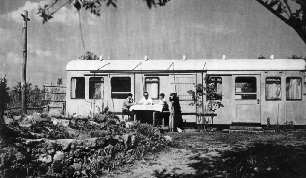 Links das um seinen S-Bahn-Wagen angebaute erste Atelier und Wohnhaus und rechts sein TABU, sein zweites-größere Atelier