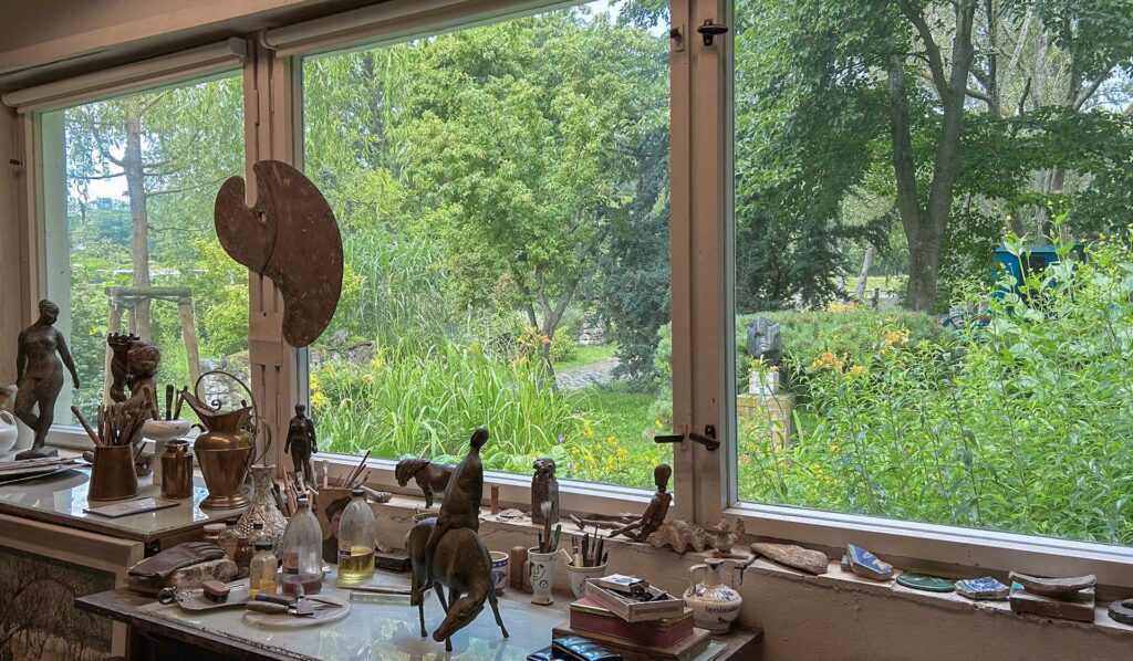 Der Blick aus seinem TABU-Atelier in den Garten. Im Winter sogar bis zum Meer.