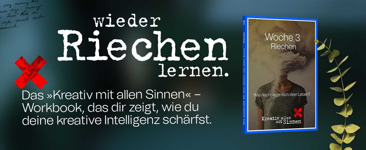 Das E-Book »wieder RIECHEN lernen« ist kein Ratgeber. Es ist ein Erlebnis. Eine Einladung, kreative Klarheit über Sinneseindrücke zu gewinnen. Statt zu grübeln, arbeitest du mit echten körperlichen Reizen. Du bekommst Übungen, die dir zeigen, wie Duftreize Fokus, Ruhe und kreative Energie in Minuten verändern.