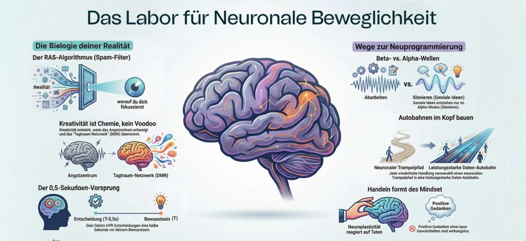 Dein Kopf ist kein Supercomputer. Er ist ein Überlebens-Junkie, der auf Energiesparmodus läuft. Er liebt Wiederholungen, hasst Neues und würde für eine Prise Sicherheit seine Großmutter verkaufen. Das ist keine Schwäche, das ist die Werkseinstellung. Wer das kapiert, hört auf, gegen sich selbst zu kämpfen und fängt an, das System auszutricksen