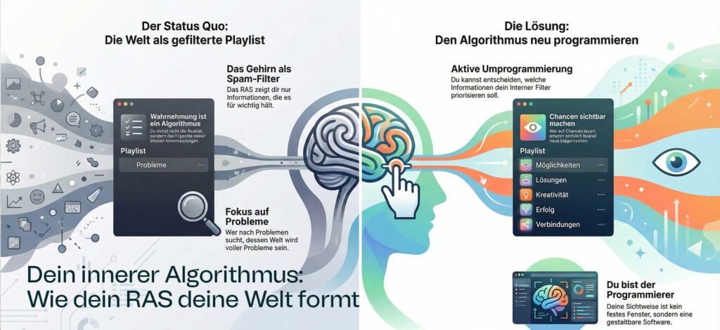 Dein Gehirn hat einen eingebauten Spam-Filter (das RAS = Retikuläres Aktivierungssystem), der dir nur zeigt, was er für wichtig hält. Wenn du auf Probleme fokussiert bist, ist die Welt voller Probleme. Wenn du auf Chancen lauerst, siehst du plötzlich überall welche. Deine Wahrnehmung ist kein Fenster zur Realität. Es ist ein verdammter Algorithmus. Und du kannst ihn programmieren.