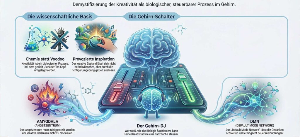 Vergiss den Quatsch mit der »Muse«. Kreativität ist, wenn in deinem Kopf die richtigen Schalter umgelegt werden. Wenn das Angstzentrum (Amygdala) mal die Klappe hält und das »Ich-lass-mal-die-Gedanken-schweifen«-Netzwerk (DMN) die Party schmeißt. Diesen Zustand kannst du nicht herbeiwünschen. Aber du kannst ihn provozieren. Wie ein DJ, der weiß, welcher Track die Tanzfläche füllt.